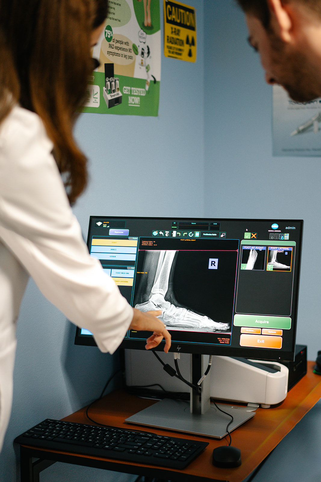 Our practice is equipped with modern technology, including PAD testing for vascular disease, diagnostic ultrasound, and in-office digital imaging for the foot and ankle. The ABI machine allows us to evaluate peripheral arterial disease early. Diagnostic ultrasound and imaging are especially helpful in identifying issues such as fractures, plantar fasciitis, and gout, ensuring you receive timely care before complications develop.